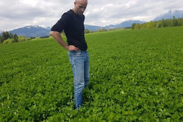 Ján Cvaniga pri kontrole porastu ďatelinovo-trávnej miešanky 9.6. 2021.